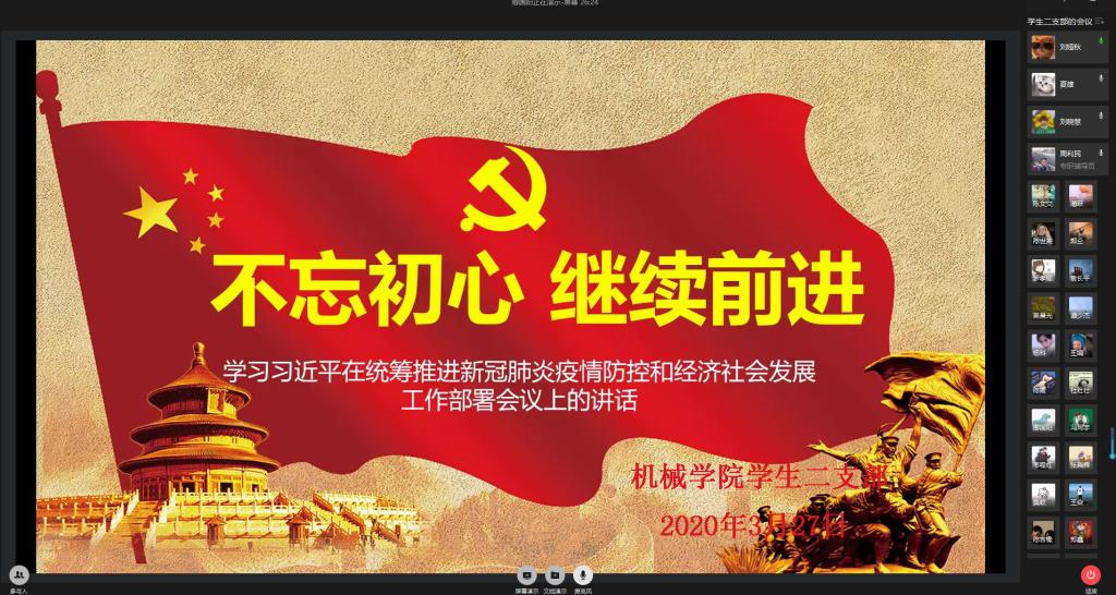 会上,支部书记周利民带领大家认真学习了《sunbet申搏官网关于 2020 年春季学期延迟开学相关工作安排的通知》等相关文件,支部党员卿国阳同志以PPT形式带领支部全体党员深入学习了《习近平总书记在统筹推进新冠肺炎疫情防控和经济社会发展工作部署会议上的讲话》。接下来,支部党员围绕此次学习内容进行了分享交流。支部党员莫蛟讲到,这场疫情,彰显了我们党强大的领导和组织协调能力,“火神山”、“雷神山”的修建以及疫情防控取得的显著成效等,让世界震惊“中国力量”和“中国速度”,我们一定能早日取得疫情防控斗争的全面胜利。支部党员刘娅秋讲到,作为一名党员,我们要起到先锋模范作用,积极参与疫情防控工作,时刻保持自己的初心。