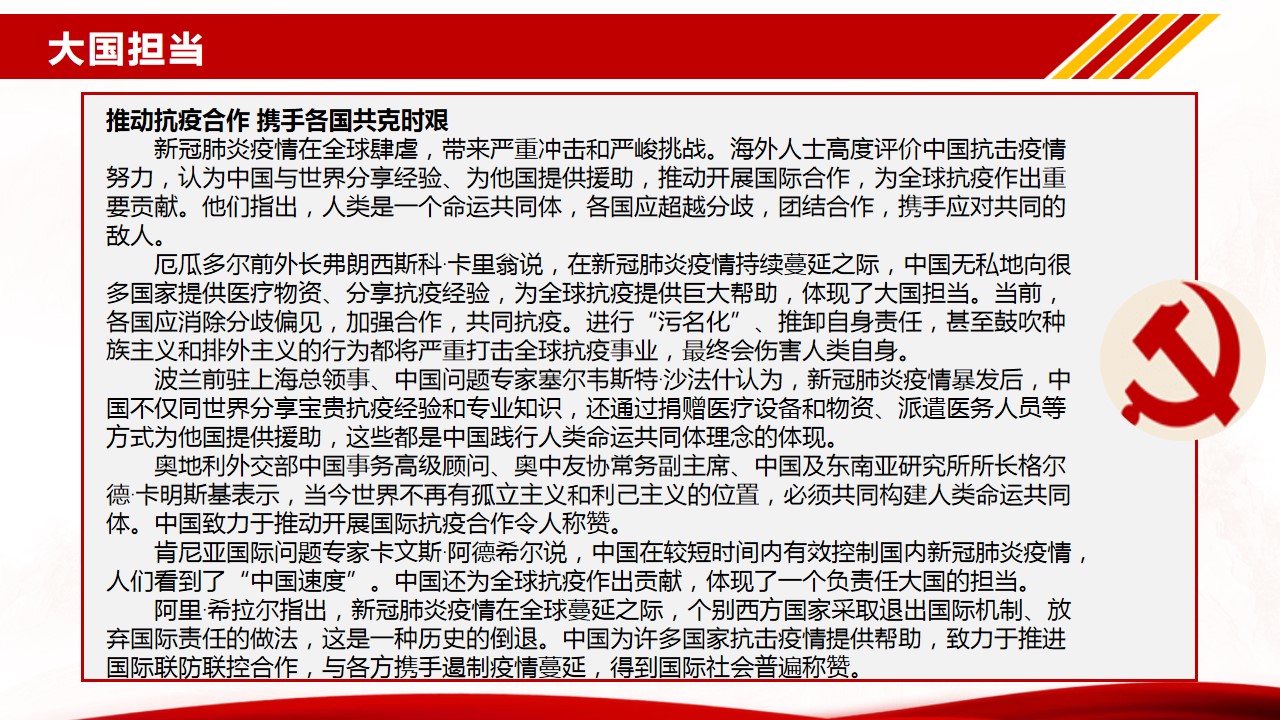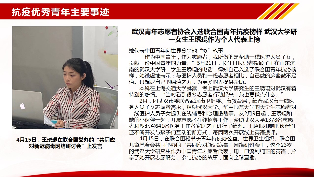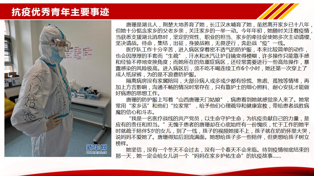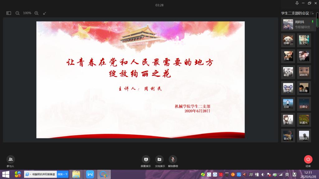 根据公司开展基层党组织常态化疫情防控“四个一”行动和“党课开讲啦”的通知,结合机械工程公司党总支的部署和要求,sunbet申搏员工二支部于6月28日通过企业微信在线方式开展了主题党课“让青春在党和人民最需要的地方绽放绚丽之花”。本次党课由支部书记周利民老师主讲,党课以疫情期间冲锋在前的几个典型的优秀青年鲜活的事例为序,带领支部党员再次把目光聚焦在疫情期间的志愿者身上,学习他们勇于担当、践行初心使命的精神。随后,结合《抗击新冠肺炎疫情的中国行动》白皮书,用一组组扎实的数据,带大家一起回顾了新冠肺炎疫情防控取得的显著成效。通过此次学习和总结,支部党员再次感受到了“中国力量”、“中国精神”、“中国社会主义制度的优越性”。抗击新冠肺炎疫情是一场大考,中国展现的出色的疫情防控能力,也为世界防疫树立了典范。