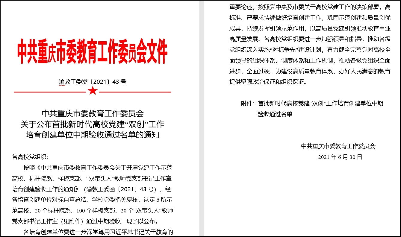 近日,重庆市教委发布了关于公布首批新时代高公司党建“双创”工作培育创建单位中期验收通过名单的通知,sunbet申搏教工第一党支部顺利通过全市首批样板支部培育单位中期验收。