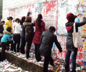 同学们不畏天气的严寒,冒着毛毛细雨,清刷着图书馆外墙上的小广告.一层又一层的小广告似乎考验着同学们的耐心与毅力。刷子、抹布、小刀、十八般武艺一齐上阵经过两个小时的努力,光洁的墙面重现眼前。