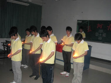 活动最后,同学们关闭灯光,相继点燃蜡烛进行爱心传递,将本次活动推向高潮。当烛光照亮了整间教室的时候,在场人员纷纷写下了自己对玉树的祝福。
