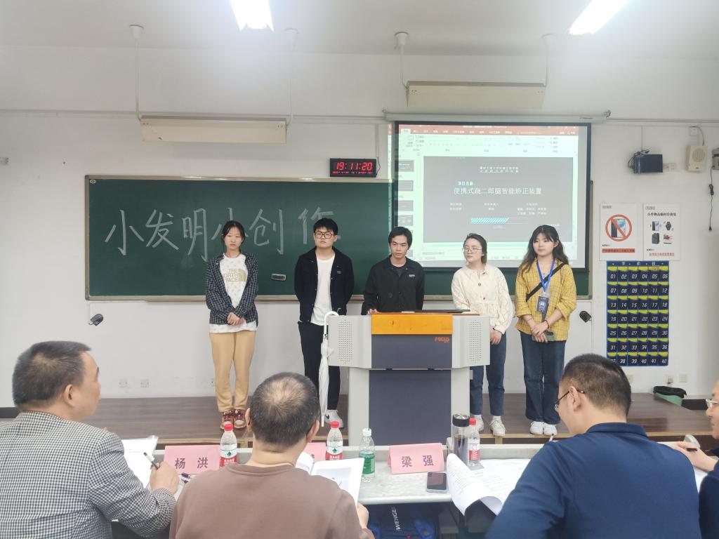 答辩环节正式开始,第一组同学的设计作品叫“便携式跷二郎腿智能矫正器”,顾名思义是从现实生活中人们的坐姿规范所得到的启发;第二组同学带来了“去渍笔”,想要简单快速地清除生活中人们因不小心产生的污渍,从而省去了清洗的麻烦;第五组的同学们介绍了“太阳能除尘路灯”,照明除尘一体化,能够高效快捷地净化环境。