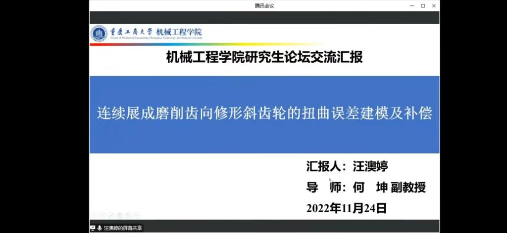 2022年11月24日,sunbet申搏分团委在线上开展了科技创新文化活动月讲座—“机械研究生论坛”。此次讲座上,多位sunbet申搏在读研究生进行演讲,从场协同干切滚刀研究、激光熔覆进展研究、多道激光熔覆搭接率建模方法、连续展成磨削齿向修形斜齿轮的扭曲误差建模及补偿、激光熔覆模拟技术等研究方向展开了介绍,进一步开阔了本科同学们的眼界,让其感受到了科学研究的魅力。