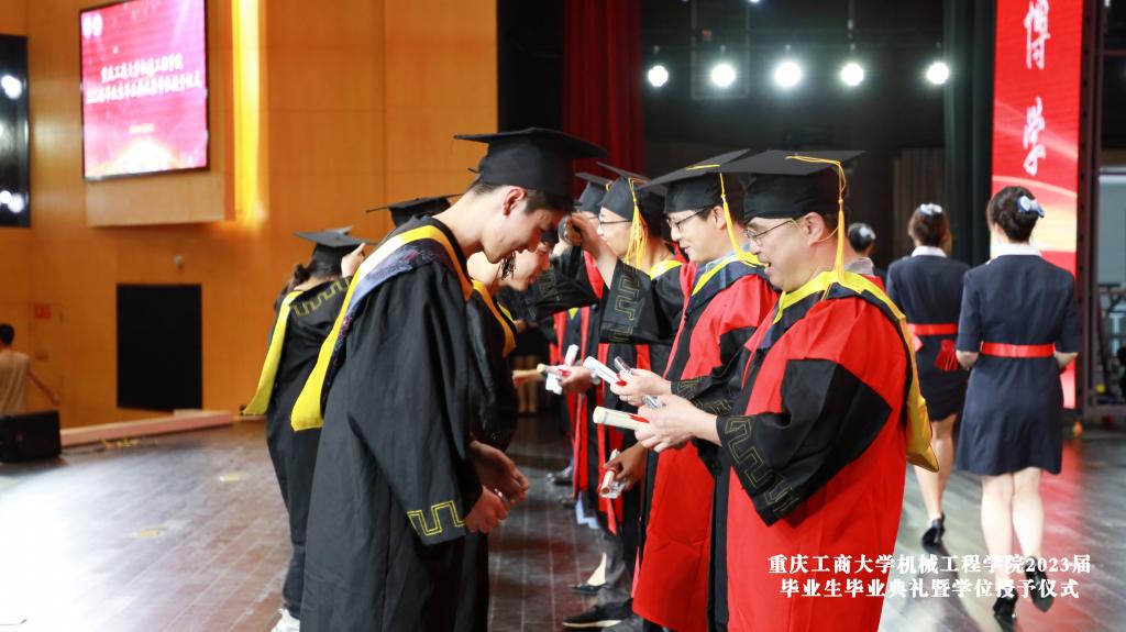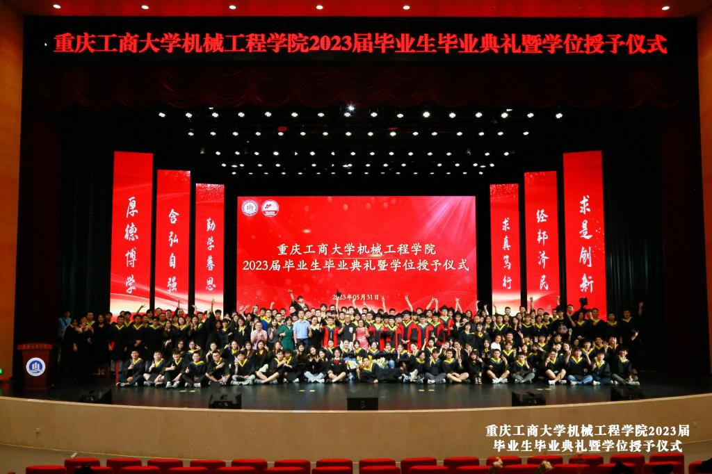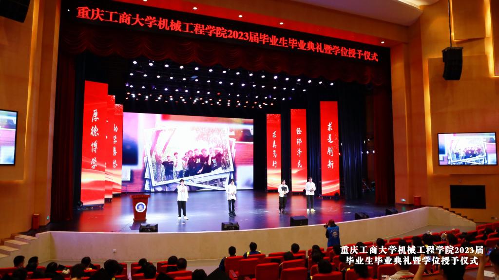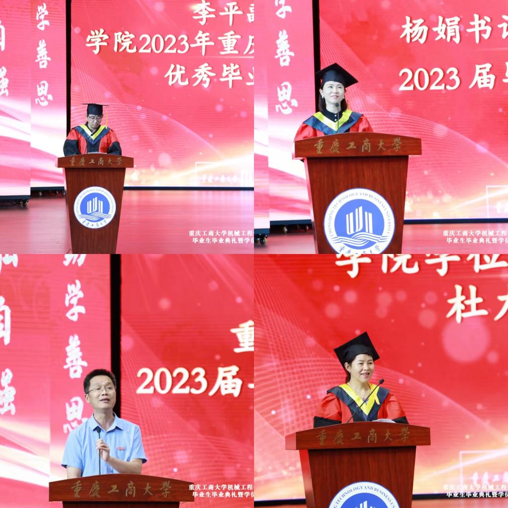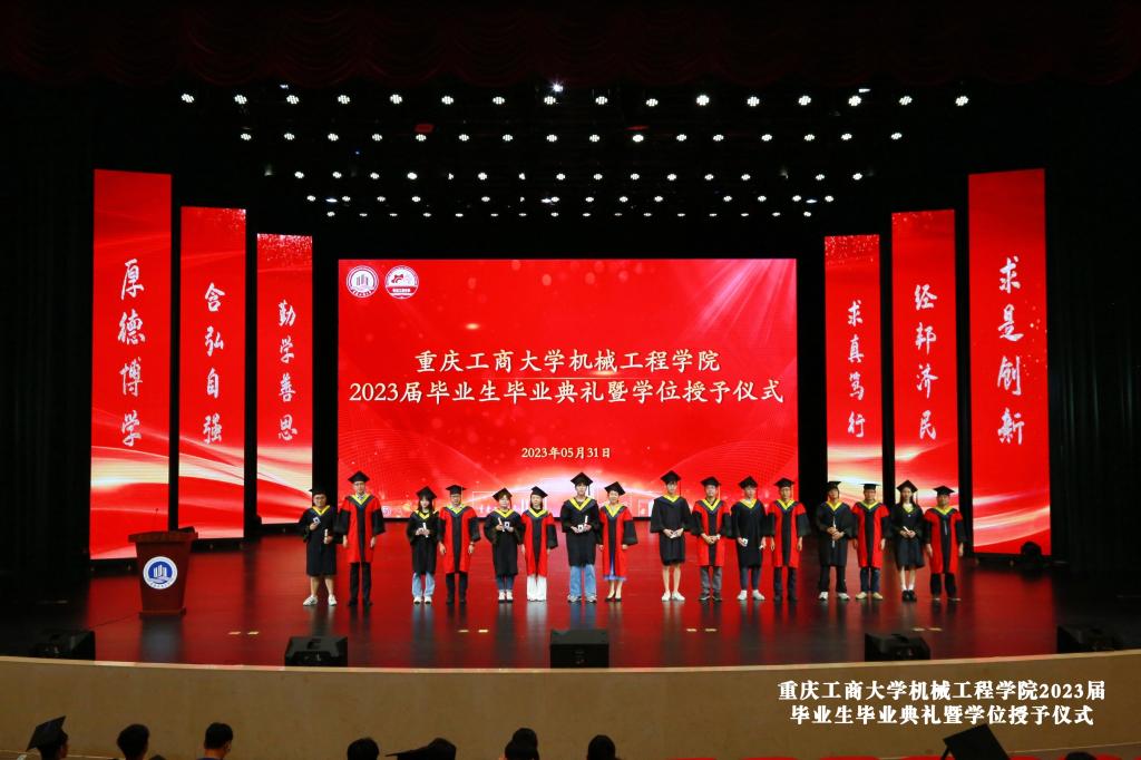 仪式在庄严的国歌声中开始,公司李平副经理宣读了2023年重庆市优秀毕业生表彰决定、sunbet申搏官网优秀毕业生表彰决定文件和获奖名单。辅导员老师刘静、邢月军、饶俊妮、刘玺、梁正伟为余江南、谢德清、严喆、黄晓琴、程渝淑、陈泓西、张慧琳、黄颖、张俊杰、旷运川等11名优秀毕业生代表颁发了获奖证书,他们或在学习实践中成绩突出,或在学科竞赛中成果丰硕,或在志愿服务中表现优异,彰显了我们机械学子德才兼备、积极向上的精神风貌。