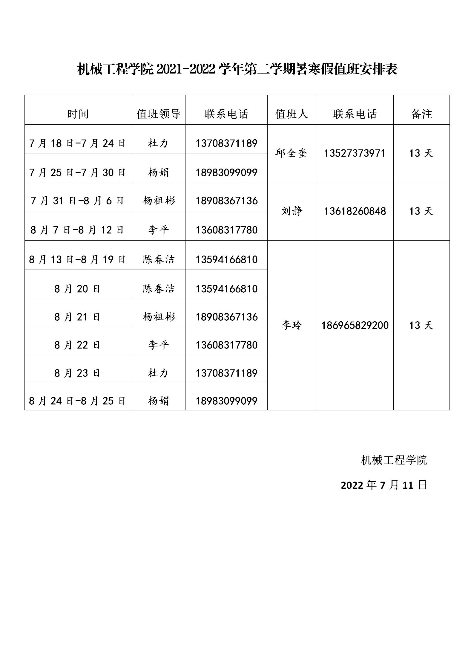 2021-2022学年第二学期暑寒假值班安排