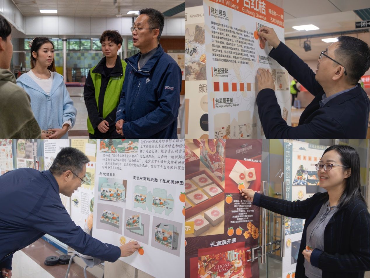 李平、陈春洁、刘静与星包装成员们共同参与了评选环节,为他们心仪的包装设计作品投票。各具特色的设计作品,不仅展示了员工们的创意才华,也展现了包装工程专业服务乡村振兴的实践成果。