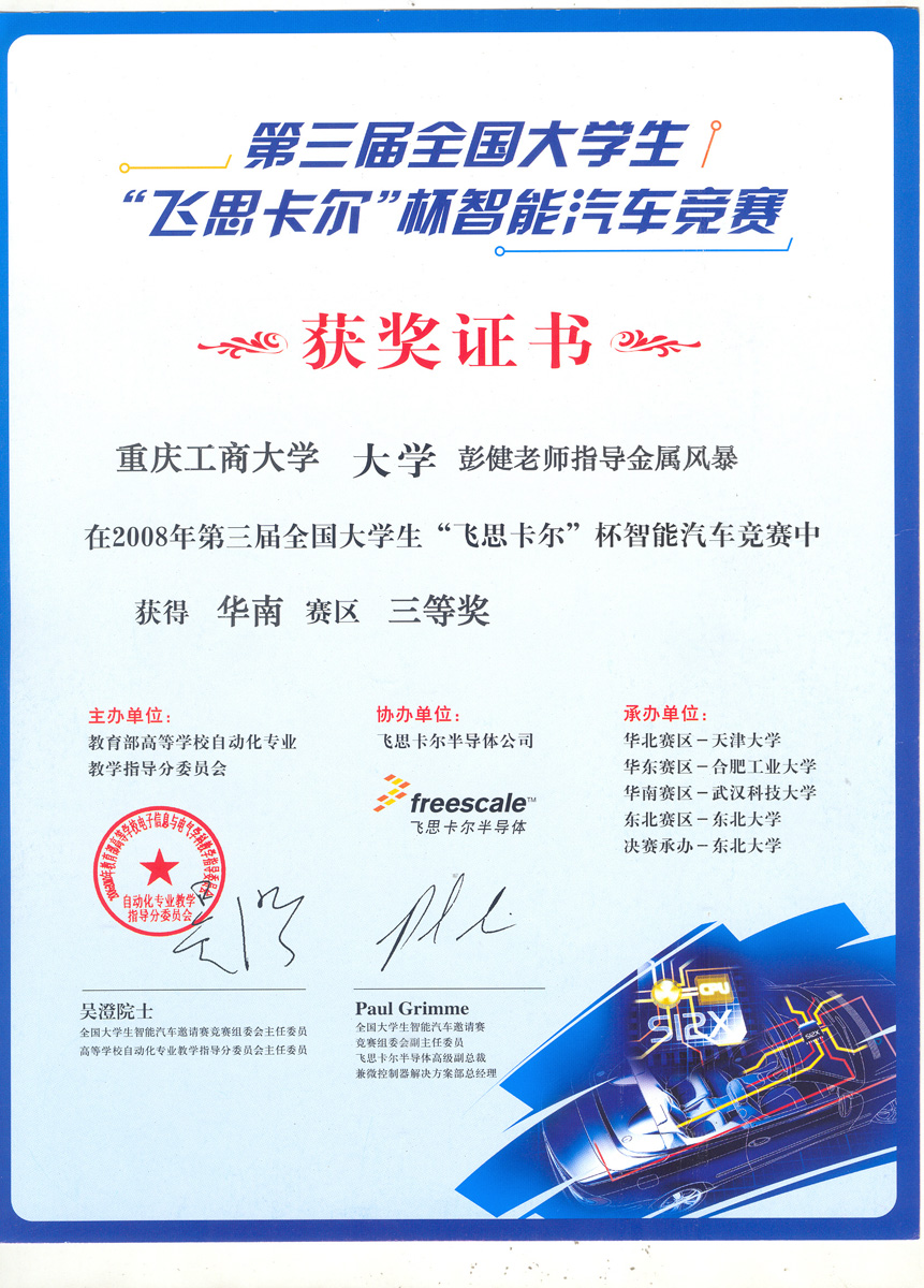 由教育部高等教育司主办的第三届全国老员工“飞思卡尔”杯智能汽车竞赛华南赛区的比赛于2008年7月23日在武汉科技大学体育馆落下帷幕。来自华南及西南地区11个省、自治区、直辖市的47所大学的 146支参赛队伍(光电组72支,摄像头组74支)参加了角逐。sunbet申搏官网机械与包装工程公司组队参加了此项比赛,并获得华南赛区的三等奖。