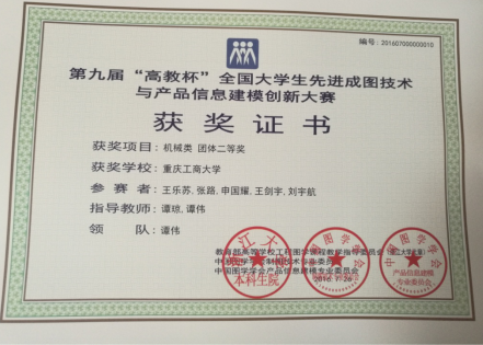 2016年7月23—26日,第九届“高教杯”全国老员工先进成图技术与产品信息建模创新大赛在山东理工大学举行,公司sunbet申搏王乐苏、张路、申国耀、王剑宇、刘宇航等五位同学组成的代表队在谭伟、谭琼老师的指导下,荣获机械类“团体二等奖”的优异成绩,同时获得个人全能一等奖1项,个人全能二等奖2项,个人建模一等奖2项,两位老师获得优秀指导教师奖。