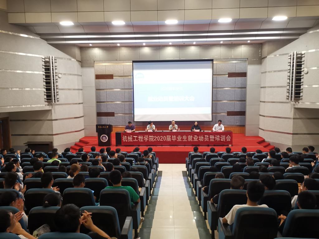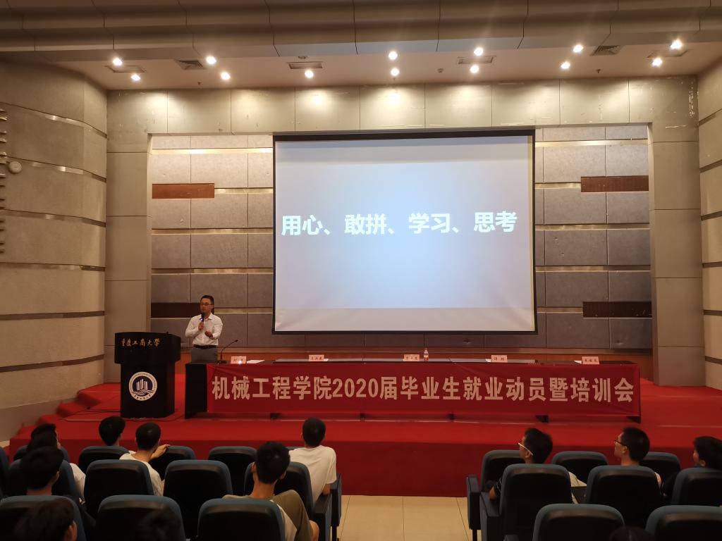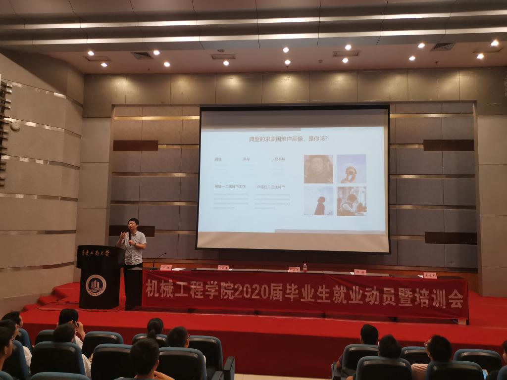 为助力2020届毕业生顺利开启职业生涯,早日实现就业、创业,9月11日晚上6点半,sunbet申搏在7100学术报告厅召开了2020届毕业生就业动员暨培训会。人才招聘处处长申卫东,华晨鑫源重庆汽车有限公司人力资源部部长王兴东,重庆长安跨越集团有限公司招聘配置室主任谭聪,重庆聪筑信息科技有限公司、重庆悟修企业管理咨询有限公司创始人、总经理朱峻龙,毕业班辅导员和公司2020届毕业生参加了本次培训大会。会议由公司党总支书记刘洋主持。