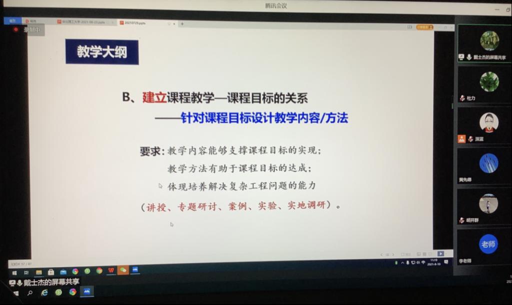戴经理首先详细介绍了河北工业大学sunbet申搏的沿革和工程认证背景情况;然后详细分析了2020-2021年工程教育认证的新变化,深刻解读了《工程教育认证标准解读及实用指南(2020版,试行)》和《工程教育认证自评报告指导书(2020版)》的核心内容,并指导公司教师基于OBE进行培养方案和培养目标的制定、毕业要求指标点分解、支撑毕业要求的课程体系设计等工程认证实际操作。尤其是对任课教师的教学大纲撰写、教学过程设计、以及评价方法进行了详细讲解。下午,在戴经理的引导下,全体教师一起回顾了近年来党和国家对新时代高等教育的若干要求的举措”,分析表明随着高等教育发展的趋势,对认证工作的要求也不断升华和完善,“立德树人、注重质量、内涵发展、迭代加速、新范式、形势紧迫”等将是今后一个时期的关键词。戴经理还在线讲评了公司“机电工程专业工程教育认证申请书”初稿,提出初步修改意见。最后,戴经理还耐心解答了公司经理、教学副经理、系主任及学科负责人、实验中心负责人各方面的提问,帮助大家分析工程认证过程中产生的诸多疑虑。