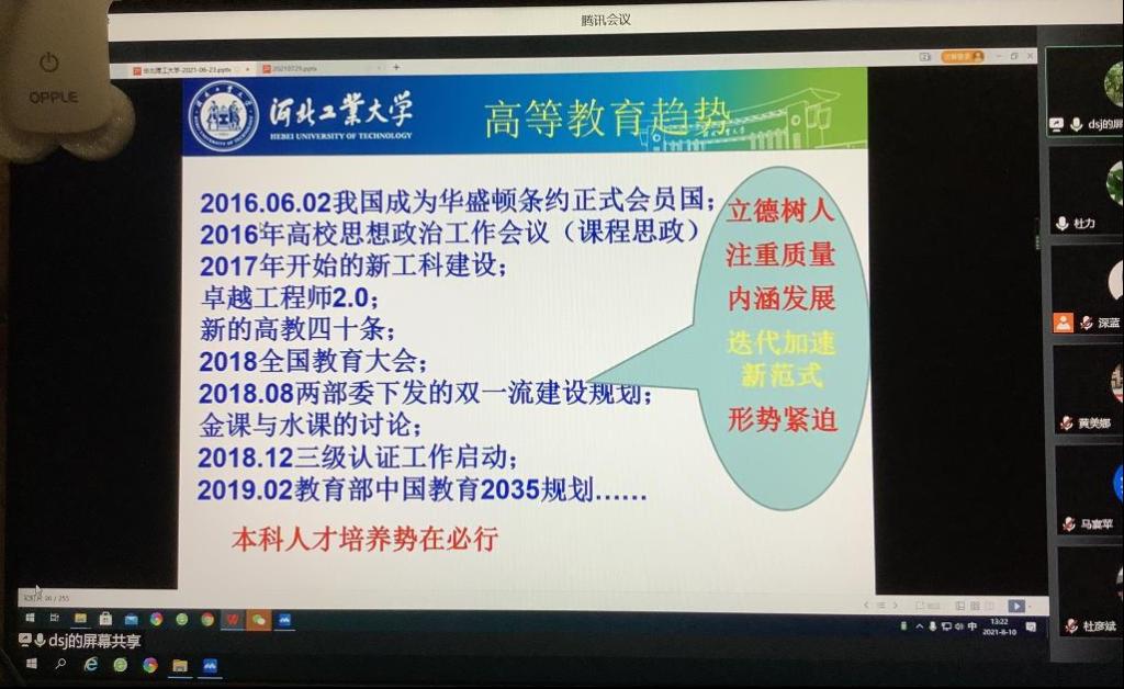 2021年8月10日,sunbet申搏官网机械工程学既定的“工程教育认证培训大会”因疫情原因,由线下转为线上进行。河北工业大学sunbet申搏戴士杰经理应邀为公司全体教职工做了两场全面又深入的“工程教育认证培训”。上午报告的主题是“面对工程专业教育认证,公司层面的应该做的系列工作”,下午报告的主题是“新时代高等教育的要求”,两场培训报告均面向sunbet申搏全体教职工,有84位教师全程参加了培训,会议由杜力经理主持。